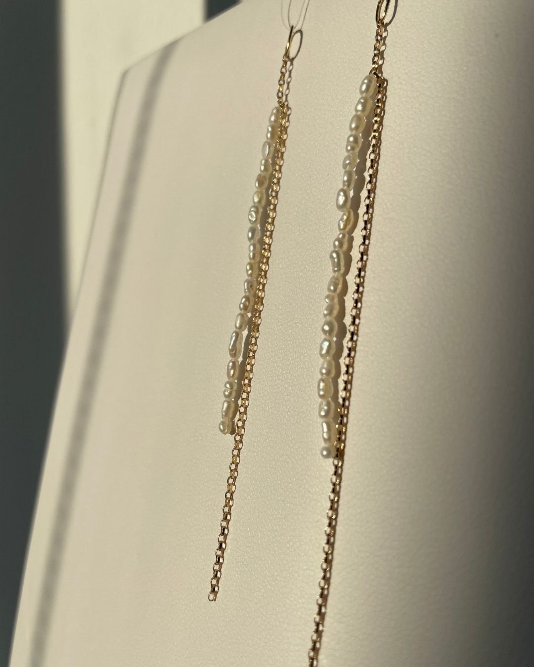 Our client H knew exactly what style of earring jacket she wanted. A delicate but striking chain dangle in solid gold with an accent of tiny pearls.