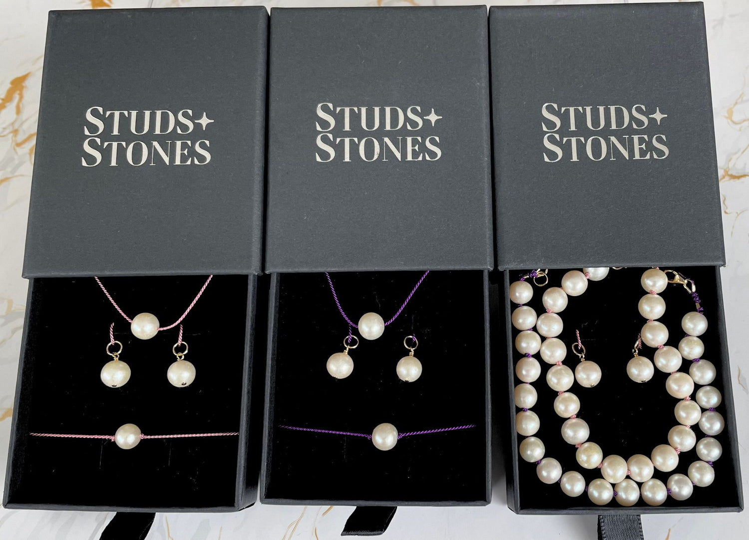 We worked with C to turn her necklace into three pearl suites. The girls each had a single pearl-on-silk necklace and bracelet in their favourite colours, pink and purple respectively. We then hand-knotted two full bracelets that C could wear now and pass on to the girls later. Luckily we had six pearls left over, so we turned these into three pairs of earring jackets, one for mum and two for the girls.