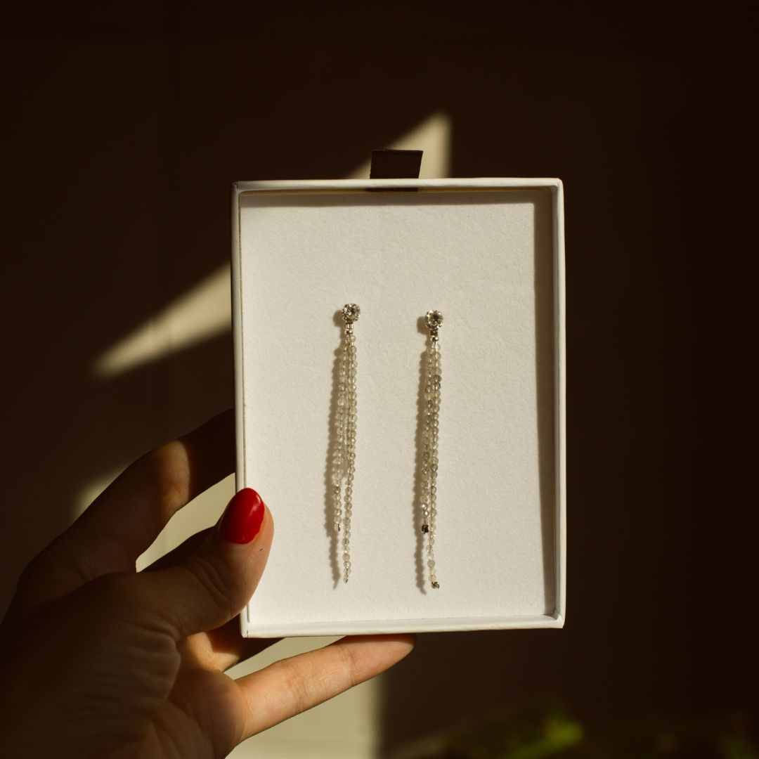 All our earring jackets come on an earring card in a gorgeous pouch and drawer box, along with care instructions.